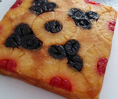 Fruit Upside Down Cake, Signature Cake Topped with Fruit of Choice. Finish with a Homemade Glaze.