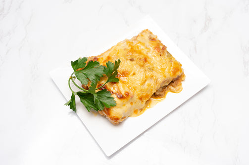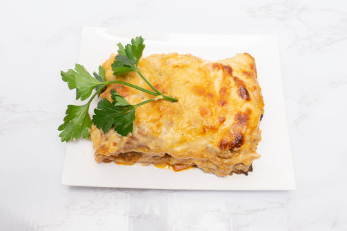 Layered ground meat, Homemade Tomato Sauce, Bechamel Sauce, and Cheese. Signature Dish.