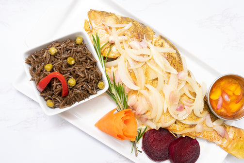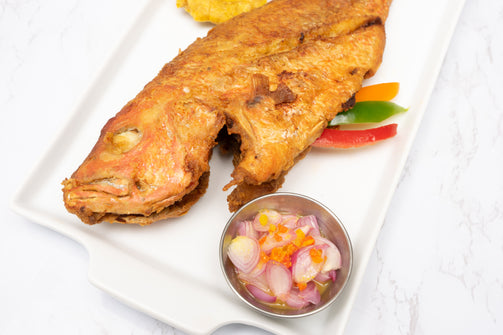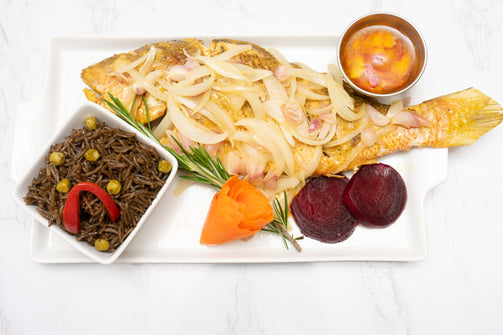 Whole Snapper, Well Seasoned, Served Fried, In Tomato Sauce or Poisson Gros Sel Creole Style Sautéed in a Bed of Buttered Onions, Peepers and Shallots